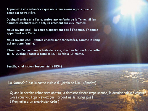 prendre conscience de son exploitation démesurée des richesses de la Terre, et changer son mode de consommation.