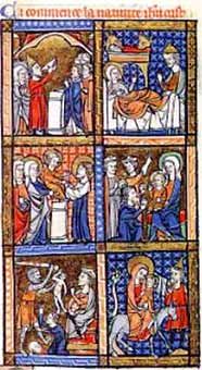 De la naissance à la fuite en Egypte. Manuscrit extrait de "La vie et les miracles de Notre-Dame" XIIIe siècle.