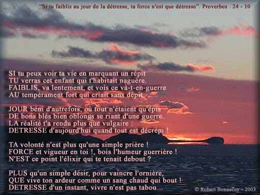 robert-bonnefoy@club-internet.fr LE petit restaurant était charmant mais vide. SEUL, je décidais donc, d'y entrer d'un pas lent, MOYEN mais bien certain, avec un air candide. DE la salle du fond, une odeur d'ortolan SE propagea soudain pour finir en Sylphide, DEBARRASSER son flux sous mon nez chancelant. D'UNE main bien levée, je commandai, avide ! TENTATION ! tentation ! mon Dieu soyez galant !. C'EST avec mes dix doigts que je jugeai, sordide, D'Y donner l'hallali dans un sublime élan. CEDER à cette chair fut pour moi l'Enéide ! LA montagne m'attend toujours vêtue de blanc, VIE intense des sens qui m'unissent à elle. EST ce la mariée qui vient d'un pas galant, UN bouquet dans sa main de givre et de dentelle ?